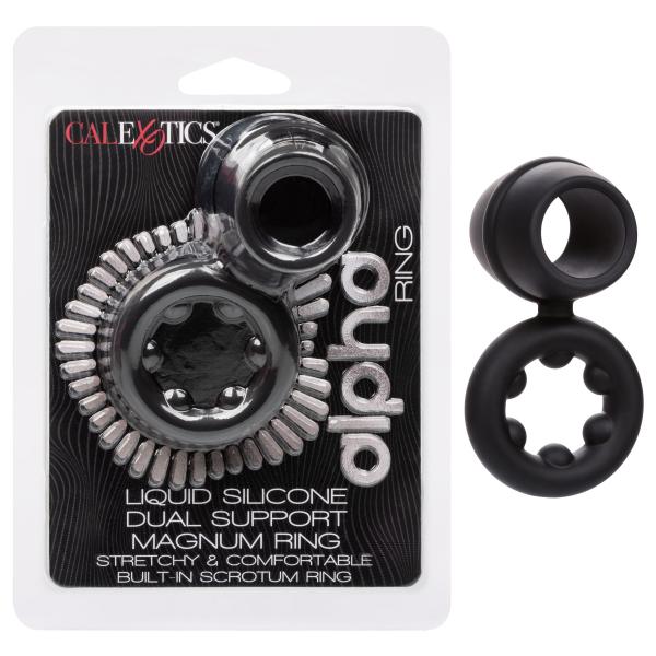 Alpha Liquid Silicone Dual Magnum Cock Ring Black from California Exotic Novelties. From bashful beginners to erotic experts, the Alpha Liquid Silicone Dual Magnum Ring will wrap you up tight in pleasure with the ultra plush, ultra stretchy enhancer ring. The playful ring is made from an ultra stretchy liquid Silicone with a daring dual ring design. This stretchy, comfortable cock ring is made to increase stamina, improve sensitivity and deliver superior erection support. The durable scrotum support ring lets you indulge even further into increased stamina. Look for an explosive pleasure experience while the plush ring squeezes with every movement. The premium liquid Silicone is soft, smooth, durable and waterproof. Specifications: SKUSE-1492-50-2. ColorBlack. 1 year warranty. Material type Silicone. Features Phthalate free, Waterproof, non-vibrating cock rings. Measurements 1.25 inches Scrotum ring diameter. 1 inch Shaft ring diameter. Bulk weight 1.7 ounces. Package 3.4 ounces. Package 2.2 inches by 5.2 inches by 7.1 inches. Please note shown on dildo for information on how to wear, not included. Categories: Sex Toys for Couples, Love Rings, Couple's Cock Rings, Men's Cock and Ball Gear. Restricted, Amazon Restricted. 2022.