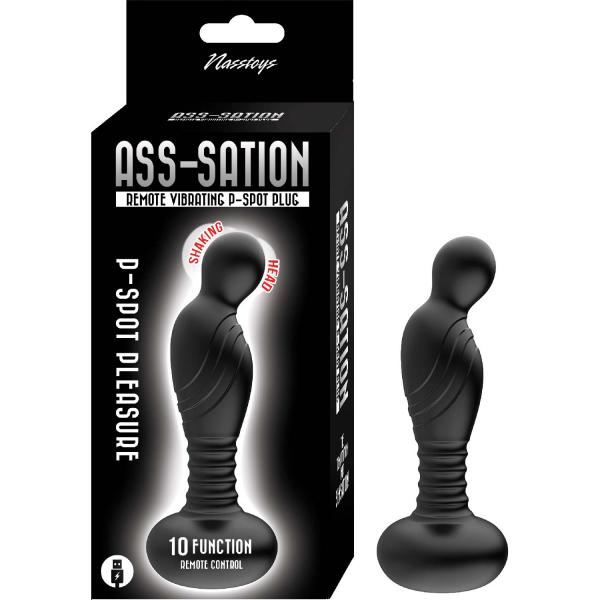 Ass-sation Remote Control Vibrating P-Spot Plug Black from Nasstoys of New York. Want to take kick your back door stimulation up a notch? The Nasstoys Ass-Sation Remote Vibrating P-Spot Plug has a rounded, chunky base that serves as the anchor for the shaft that moves from an accordion stem. The textured shaft moves with your body no matter how you like to play and the round head at the tip that moves in a come hither motion back and forth for incredible stimulation. Explore the 10 speeds and rhythms in the head or center bulb using easy navigation in the base or play hands free with the remote control. A sturdy, dual motor toy with strong shapes and curves. Both 10 speed motors work simultaneously, controlled by the remote control or operated directly. Charge fully before first use to prime the battery of your new toy. Use this toy your favorite water based personal lubricant for the most pleasurable experience. After use just carefully wash the anal toy with mild soap and water or try some Toy Cleaner for even quicker clean up. Followed by a warm water rinse. Pat dry before storing.