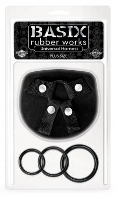 Basix Rubber Works Universal Harness Plus Size. The Basix Universal Harness is available in Regular and Plus-Size and includes 3 silicone rings. Each sold separately. Easy to adjust and fun to use for sexy strap-on play. Most of the Basix dildos are Strap-On ready and Harness Compatible. Includes small 1.2 inches, Medium 1.6 inches and Large 2 inches. Silicone rings. Material: PVC. Country of origin China. Basix Universal Harness is featured in Pipedream Products 2012 Basix, page 6. Shown with dildo. Dildo not included. Sold separately.