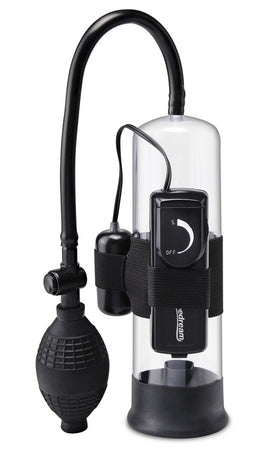The Beginner's Vibrating Pump from Pipedream will give you the size and confidence you have always dreamed about without any harmful side effects. With each squeeze of the medical style pump ball, your pleasure rod will grow bigger, thicker, and swell with power. Once you penetrate the smooth, flexible PVC opening, you will quickly discover throbbing, rock-hard erections that feel great and last and last with no midway performance letdowns! The clear vacuum tube allows you to watch your cock grow, and the quick release valve relieves pressure with a push of the button.