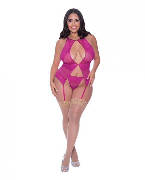 From the Exposed by Magic Silk collection, this style includes: a halter style basque featuring elastic adjustable shoulder straps with gold tone sliders, silk lace-up ribbon in the back, gold tone swan hook closure in the lower front, removable adjustable garters with gold tone sliders, and a matching lace g-string. Fabric: Lace: 90% Nylon, 10% Spandex Mesh: 84% Polyester, 16% Spandex.Hand Wash Cold. No Bleach. Dry Flat.1SZ Queen fits size 20-24 (1-3X)
