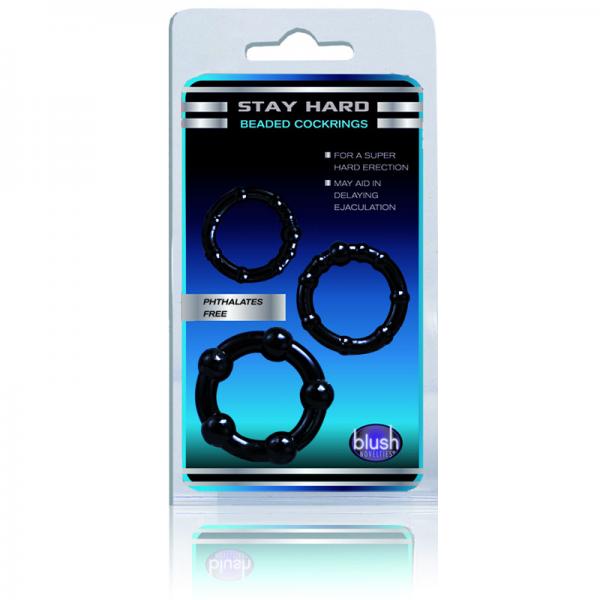 Perform like the stud you are! These Stay Hard Cock Rings come in 3 sizes, so you can use them individually or all 3 at once. The Small Ring is for maximum erections; Medium Ring is for hard erections; Large Ring can be used to encircle the upper part of your scrotum to help prevent premature ejaculation. They are made of Elastomer, a super stretchy, comfortable and Phthalate Free material developed specifically for your safety and hygiene during your intimate play. So, if you�re looking for a safe way to increase both in size and stamina, you and your partner are sure to enjoy Blush Novelties Stay Hard Cock Ring and your bigger, better erection that lasts even longer!