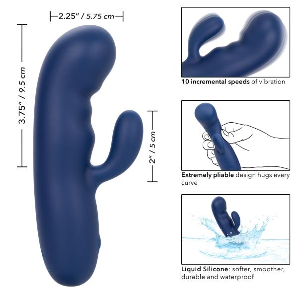 Cashmere Silk Duo Vibrator from California Exotic Novelties. Experience the luxurious pleasure of the Cashmere Silk Duo, a powerful dual motor massager designed to fulfill your deepest desires. Its perfectly curved tip provides exquisite G-Spot stimulation, while the flexible shaft and highly pliable design ensure a comfortable and personalized fit, caressing every contour of your body. With 10 incremental speeds of vibration, you can explore a variety of intensities to find the ideal level of stimulation for your pleasure. Crafted from premium liquid Silicone, the massager offers a velvety smooth and durable texture that feels heavenly against the skin. It is also waterproof and boasts an IPX7 submersible rating, allowing you to immerse yourself in sensational moments in and out of the water. Equipped with a state of the art memory chip, it remembers your last used function, effortlessly resuming your favorite mode for uninterrupted pleasure. The security travel lock feature ensures worry free transportation, while the USB rechargeable design provides convenience and sustainability. A charging cord is included, and a full charge takes approximately 2 hours. Once fully charged, the Cashmere Silk Duo indulges you with up to 55 minutes of high speed stimulation and 80 minutes of low speed bliss. Unleash your desires with the Cashmere Silk Duo and let its powerful vibrations transport you to a world of unparalleled pleasure and satisfaction.