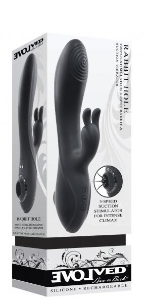Evolved Rabbit Hole Black Vibrator from Evolved Novelties. This hard working triple threat adult toy delivers three powerful experiences in one elegant shape. The flexible 10 speed main shaft gently curves and swells to a G-Spot tip with circular textures at the head while the tireless 10 speed rabbit stimulator bops and bends with your body for intense stimulation. Flip the toy over for a glorious 3 speed suction sensation that pulls and teases, building to an erotic climax. Keep an easy grip with the textured handle and recharge magnetically via USB. Splashproof and easy to clean. Features: triple stimulation G-Spot, Rabbit and suction vibrator. Circular textured G-Spot head in 10 speed main shaft. 10 speed rabbit stimulator. 3 speed suction stimulator. Motors controlled independently. Flexible shafts move with your body. Textured shaft and handle for solid grip. White Light Emitting Diode LED light illuminates buttons when in use. Made from creamy smooth Silicone. Detail made from black chrome finished ABS plastic. Size height 8.34 inches, depth 2.42 inches, width 1.66 inches. Insertable length 4.5 inches, insertable diameter 1.57 inches. Bulk weight under half a pound, .5 lb, 7.6 ounces. Phthalate and latex free. Splashproof not submersible. Magnetic rechargeable, USB cable included. Categories: Vibrators, Rechargeable Vibrators, Sex Toys for Women, G-Spot Rabbit Style Vibrator. 2022.