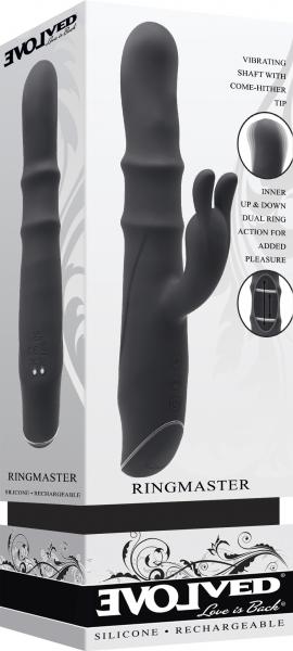 Evolved Ringmaster Rabbit Vibrator. This Ringed Rabbit Vibrator features 2 powerful motors that drive 4 pleasure filled functions! 10 speed vibrations jolt through the main shaft and bunny ear stimulator simultaneously, while the come hither wag in the head operates together with the up and down motion of the central rings. Control each motor separately with a 3 button light up control panel and take this multi-thriller into the bath or shower with you as it is completely water submersible! Magnetic USB Rechargeable and easy to clean.