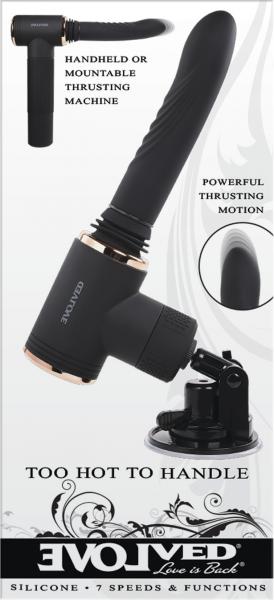 Evolved Too Hot To Handle Powerful Machine is sophisticated design meets ultimate satisfaction with this powerful machine that makes your pleasure its top priority! An adjustable suction cup mount gives you hands free play like you have never experienced! Click the sleek Silicone shaft into the main barrel and away you go, thrusting in 7 glorious speeds with over half an inch of delicious push. Then unleash the vibrations for 7 speeds to rock your world, and do not forget the heating function that warms you up from the inside! An elegant 3 button control panel allows access to each separate motor with ease, giving you the ride of a life time! And when it is time to clean up, the shaft packs up into the long handle, everything comes with a neat cap for storage. Rechargeable, splashproof and easy to clean! Features: thrusting, heating, vibrating machine. Detachable vibrating shaft. Vibrating shaft stores in unscrewable handle. 7 thrusting speeds and functions .7 inch thrust. Heating function maximum temperature 35 degrees Celsius C or approxmiately 95 degrees Fahrenheit F. Adjustable suction cup mount. Caps to cover thruster and suction mount. Textured shaft for extra stimulation. Light emitting diode LED lights illuminate buttons when in use. Size adult toy height 9.3 inches, depth 5.2 inches, width 2.2 inches. Attachment size height 6.15 inches, depth 1.35 inches, width 1.38 inches. Bulk weight over 1 pound. Made from body safe phthalate free materials: Silicone vibrator and ABS plastic base. Color Rose Gold finished details. Phthalate and latex free. Magnetic rechargeable, USB cable included. Splashproof for easy cleaning and shower play. 5 years warranty. Categories: Sex Swings, Machines, Erotic Furniture, Vibrators, Rechargeable Vibrators, Dildos, Dongs, Sex Machines. 2022.