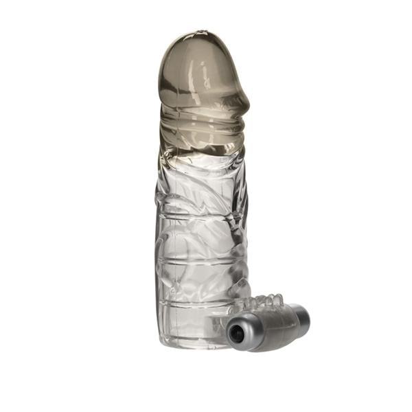 Extend it Up! Vibrating Extension Sleeve Smoke. Adds 2 inches to your length. Stretchy and comfortable enhancer. Removable and reusable vibrating stimulator. Easy push button control. Enhances stimulation for you and your partner. Waterproof for play in and out of the water. Safe and pure for body and pleasure. Made using phthalate free materials: Thermoplastic Elastomers TPE penis sleeve, ABS plastic with metallic plating stimulator. Vibrating extension requires 3 watch batteries, 6 included. Bulk weight 2.2 ounces. 5 inches by 2 inches. Category: For Men, Rings & Sleeves, Sleeves, Extensions.
