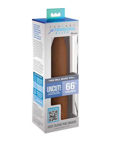 Fantasy X-Tensions Elite Uncut 7 inches Sleeve Tan Medium Skin Tone from Pipedream Products. Made from ultra hygienic Elite Silicone, this performance enhancement sleeve fits like a glove and feels like a second skin, giving wearers extra length, increased girth, and maximum confidence. Satisfy your partner and avoid embarrassing midway let downs with your new secret weapon! Perfect for people with Erectile Dysfunction ED and performance anxiety, Fantasy X-Tensions Elite enhancers will deliver results both partners will appreciate. Your Silicone Fantasy X-Tension Elite can be easily trimmed at the base for a perfect fit. It is super stretchy to accommodate most sizes and snug enough to help you last longer. Both partners will enjoy deeper penetration with the removable extenders, while the ultra realistic sleeve makes the wearer 66% thicker all around. This could be you! Operating instructions quick use guide: 1. fold sleeve inside out until extender can be put inside the tip. 2. add lube and place extender inside the sleeve. 3. place penis head against the extender. 4. pull sleeve down until it covers your entire shaft. 5. enjoy your new life! Care instructions: remove extender from sleeve and power off after each use. Thoroughly clean both sleeve and extender with antibacterial cleaner and warm water after each use. Allow interior of sleeve to dry completely before storing away. Cleaning and drying your X-Tension after each use is key to extending its life as well as being healthier for your penis. Pro tip: for a deep clean, the sleeve can be placed in boiling water for 3 minutes. Always let sleeve and extender cool before handling. Caution: high heat will damage the electronic components inside. Caution: do not use with Oil Based Lubricants or Silicone Based Lubricants. This device is not a protection against pregnancy, HIV/AIDS, and other STIs. Prolonged and frequent use of penis enhancing devices may cause ruptured blood vessels, hemorrhage, and hematoma formation. This device can also aggravate existing medical conditions such as Peyronies disease, priapism, and urethral stricture. Penis enhancing devices are intended for adult use only. 365 days warranty. Categories: Realistic Extensions, Penis Extensions, PPAs, Prosthetic Penis Attachments, Men's Cock and Ball Gear, Male Extensions. 2022.