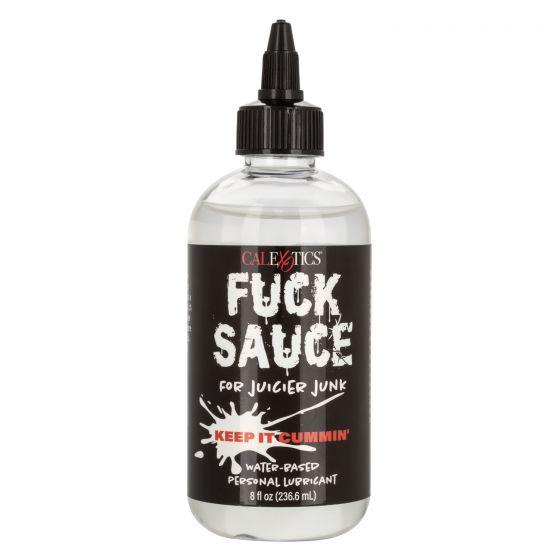 Fuck Sauce Water Based Personl Lubricant 8 fluid ounces from California Exotic Novelties. For juicier junk. Keep it cumming. Everything is better with sauce on it and the Fuck Sauce Water Based Lubricant is sure to have you coming back for more. The premium water based formula is sure to enhance natural lubricant and provide the very best glide. Keep playtime going as long as you can with the super slick formulation for a naturally moisturizing and long lasting effect. Expertly created by the sexual health experts at Cal Exotics, the water based formula is hypoallergenic, pH friendly, safe for all skin types and free from artificial fragrances and colorants. Made in the USA. How to use: use as needed to enhance intimacy and lubricate pleasure. Apply a small amount of water based lube to desired area to lubricate, reapply as needed. Easily washes away with warm water. Specifications: SKU SE-2405-10-1. Color Clear.1 year warranty. Measurements/volume 8 fluid ounces. Bulk weight 9.3 ounces. Package 2.19 inches by 2.19 inches by 6.13 inches.