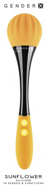 Gender X Sunflower Double Vibrator from Evolved Novelties. Two powerful motors in one stylish double ended vibe! Treat yourself to this two faced robust machine with a textured round wand head on one end and a long, thin oval head on the other. Let the ball roll and rumble wherever feels good and use the slender oar for more targeted vibrations. Motors are controlled separately and feature 10 speeds and vibrations each, with an easy to use 2 button control that lights up for visibility, even under water as this toy is completely submersible. Rechargeable, latex free and easy to clean. Features: powerful dual ended vibrator. Textured, round wand head on one end. And a long, thin, smooth head on the other end. Strong, rigid connecting stem. 10 vibrating speeds and functions. Motors controlled separately. Easy to use 2 button control. Light emitting diode LED illuminates buttons when in use. Made from silky smooth Silicone. Stem made from black chrome finished ABS plastic. Size: height 7.87 inches, depth 1.81 inches, width 1.81 inches. Bulk weight under .5 pound. Waterproof vibrations and submersible for cleaning and for bath tub play. Phthalate free latex free. Magnetic rechargeable, USB cable included. 5 years warranty. Categories: Sex Toys for Couples, Rechargeable Vibrators, Double Dongs, Sex Toys for Women. 2022.