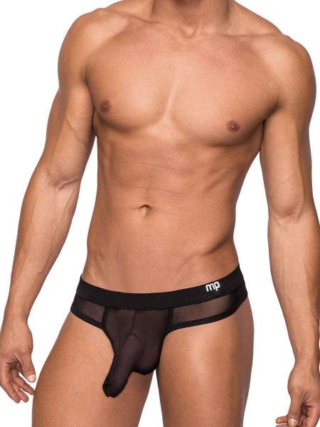 Male Power Hose Thong Black Small/Medium. Take your underwear to a whole new level with this unique thong. Featuring an elongated shaft that keeps you extra cool, a one inch cheeky thong back, and a modal finished waist band that slims and flattens. Ultra soft, high end stretch mesh completes the look and adds to the all day fresh feel.
