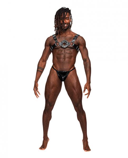 From the Leather collection by Male Power, this style includes a chest harness featuring an oval front opening with metal rings, fully adjustable buckled straps, metal studs. Soft Nubuck Leather with Polyurethane coating, heavy metal rings, buckles, and studding. Fabric : Polyurethane coated split leatherCare Instructions: Do Not Wash, Do Not Bleach, Do Not Tumble Dry.One Size.