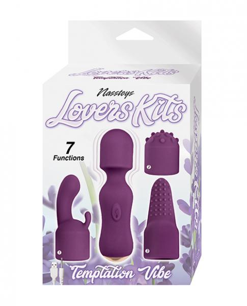 Lovers Kits Temptation Vibe is perfect for a night alone or weekend away with a partner! The mini wand head is flexible to move with your body and delivers 7 rumbly vibrations. 3 interchangeable sleeves may be placed over the wand head to change the desired sensation! All made from 100% soft, silky silicone. Press and hold the button on the bottom of the wand to power on then press again to cycle through the vibration patterns. To charge, insert the pin charger into the product and the USB connector into a power source. Please clean with toy cleaner before and after each use. Enjoy with a water-based lubricant