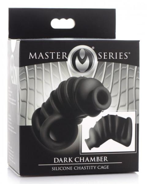 Master Series Dark Chamber Silicone Chastity Cage from XR Brands. Confine his cock in this Dark Chamber! This Silicone Chastity Cage is soft, flexible, and velvety for a more forgiving lock up compared to metal and plastic chastity cages. The Dark Chamber features a soft skeleton of slightly firmer Silicone for that authentic cage feel, but still molds with your body for comfort during wear. Designed and constructed with premium, velvety silicone for a comfortable caging! The Dark Chamber features a cum through tip for easy relief during wear, making this comfy cage perfect for extended chastity scenes for beginners and experts. Unlike cages made from plastic and metal, the Silicone material is travel friendly and discreet. The flexible nature works with your clothing rather than against it, so you can go about your day protected without a large bulge in your undergarments! This cage is held in place thanks to a snug cock and ball opening. Measurements overall length 4 inches, cage opening diameter, unstretched 1.7 inches, ball strap opening diameter unstretched 0.8 inch. Materials Silicone. Color Black. Key featuresflexible for maximum comfort. Wear this cage over long durations. The flexible cage fits snug over your package and can easily be adjusted. Open tip: this open cum through tip makes it easy to use the restroom with the device still on and the narrow funnel helps with aim. Flexible Silicone this soft and stretchy material is easy to clean and travel friendly. Unlike metal, it will not set off any alarms or metal detectors. XR Brands - Master Series. Categories: Bondage, Fetish and Kink, Love Rings, Mens Fetish Wear, Mens Cock & Ball Gear. 2022.