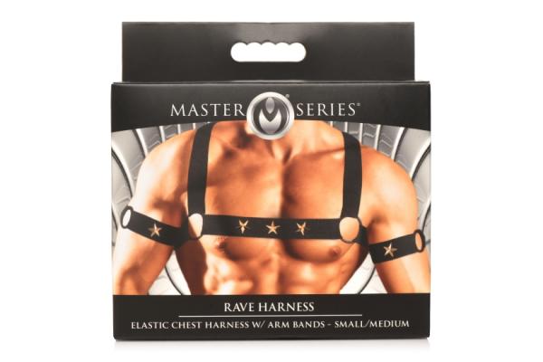 Master Series Elastic Chest Harness with Arm Bands S/M from XR Brands. Star Boy Male Chest Harness With Arm Bands - S/M. Add some flair to your wardrobe with this comfortable, stretchy harness and armbands! The nickel free, metal stars adorn the front of the harness and the armbands to easily go with any type of outfit! The stretchy material is soft against the skin, easy to hand wash or machine wash, and gives you a snug fit that shows off your chest and arms! Wear it with an open shirt over it, or with no shirt at all! Looks great with booty shorts, long pants or a jock strap. It can also go underneath a fishnet shirt or simply be the sexy addition that you wear in the bedroom!