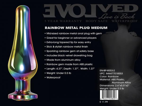 Rainbow Metal Plug Medium from Evolved Novelties. Treat yourself to delicious back door pleasure with this mid-sized rainbow colored metal anal plug that features an extra long tapered tip for easy entry. Boost your orgasmic potential while adorning your booty with a sexy, sparkling rainbow gem! Try heating or cooling your plug before hand to indulge in a sensory twist. Use with plenty of lubricant, and clean with Evolved Toy Cleaner and hot water. Velvet drawstring bag included. Specifications: mid-sized rainbow metal anal plug with gem. Great for beginner or advanced players. Extra long tapered tip for easy entry. Slick and stylish rainbow metal finish. Sparkling rainbow gem at safety base. Includes black velvet drawstring bag. Made from aluminum alloy. Rainbow gem made from ABS plastic. Length 4.37 inches, depth 1.37 inches, width 1.37 inches. Weight under .5 pound. Waterproof, non-vibrating plug. 5 year warranty.
