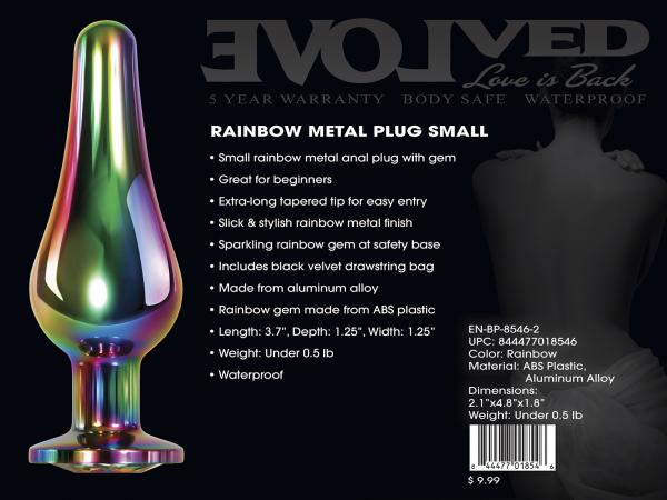 Rainbow Metal Plug Small from Evolved Novelties. Discover the unique pleasure of back door play with this small rainbow colored metal anal plug that features an extra long tapered tip for super easy entry. Boost your orgasmic potential while adorning your booty with a sexy, sparkling rainbow gem! Try heating or cooling your plug before hand to indulge in a sensory twist. Use with plenty of lubricant, and clean with Evolved Toy Cleaner and hot water. Velvet drawstring bag included. Specifications: small rainbow metal anal plug with gem. Great for beginners. Extra long tapered tip for easy entry. Slick and stylish rainbow metal finish. Sparkling rainbow gem at safety base. Includes black velvet drawstring bag. Made from aluminum alloy. Rainbow gem made from ABS plastic. Length 3.7 inches, depth 1.25 inches, width 1.25 inches. Weight under .5 pound. Waterproof non-vibrating butt plug. 5 years warranty.