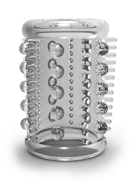 Stretchy and textured enhancement sleeve adds pleasure and sensation. Just slide over your shaft or a dildo. One size fits most. Measures 2.04 inches long, 1.57 inches diameter, 4.92 inches circumference.