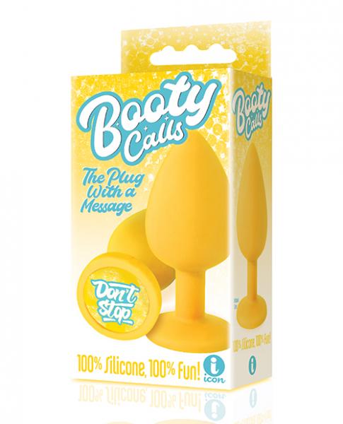 The 9's Booty Calls Butt Plug Yellow Dont Stop from Icon Brands. Made using body safe phthalate free materials Silicone. The plug with a message. 100% silicone. 100% fun.