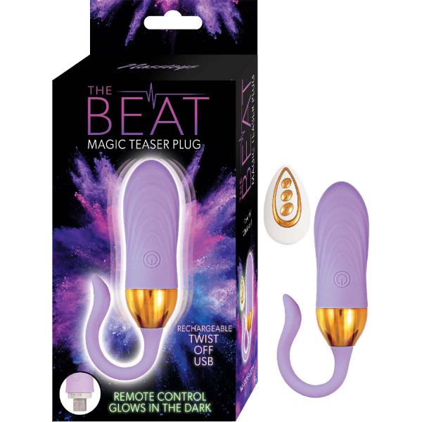 The Beat Magic Teaser Plug Lavender from Nasstoys of New York. Explore backdoor pleasure like never before with the Beat Magic Teaser Plug, a revolutionary butt plug that will leave you spellbound. Let the glowing remote control guide you through intimate journeys, and revel in the whisper quiet sensations that this discreet plug delivers. Embrace the magic and indulge in your deepest desires Discover a new level of comfort with the Beat Magic Teaser Plugs unique one-sided base. This thoughtful design ensures a secure fit, allowing you to wear it with confidence and explore new realms of pleasure. Embrace the convenience of hassle free charging with the twist off USB charger. No cords are necessary, simply twist and plug the USB charger into any compatible power source to recharge your magic teaser plug in no time. Take control of your desires with the remote controlled functionality of this plug. The included remote control empowers you or your partner to customize the intensity and patterns of vibrations from a distance, adding a whole new dimension to your pleasure play. Unleash your passions even in dimly lit surroundings as the remote control glows in the dark. The luminous feature allows for easy navigation, so you can focus on the pleasure ahead of you. 10 Powerful vibrations. Discreetly quiet. Body safe Silicone. G-Spot stimulation. Remote control glows in the dark. RoHS compliant. Phthalates free. Waterproof vibrations. Materials: Silicone and ABS Plastic. Length 4.5 inches, width 1.125 inches, height 1.125 inches, insertable length 4 inches, circumference 3.75 inches, Remote control 2.5 inches by 1.5 inches. Rechargeable twist off USB, no cords necessary: Charging time: 30 minutes, working time 60 minutes. Battery = 1 CR2023, included.Voltage 3.7V. SKU: NW3153-2. Specialty Vibrators. Categories: Anal Toys, Small, Medium Butt Plugs, Vibrators, Bullets and Eggs, Rechargeable Vibrators. 2023.