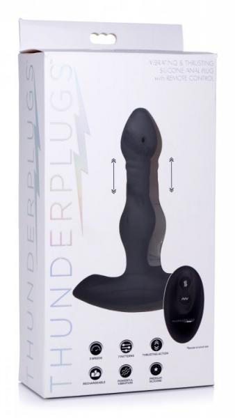 Thunder Plugs Vibrating and Thrusting Anal Plug from XR Brands. Treat your ass to a plug that vibes and thrusts! Ergonomically designed for a satisfying fill and precise pumps, the bulbous tip and textured shaft rub and stimulate your depths, while the narrow shaft and base keeps things easy on your backdoor entrance. Enjoy every inch and every function with ease. The convenient control buttons make it easy to change functions as you play, while the included remote control makes things even easier for solo or partner play! Choose from 3 speeds and 7 patterns of vibrations alongside 3 thrusting speeds. Pick and choose what works for you and recharge when the power runs low with the included USB charging cable. Made with silky smooth Silicone for a premium feel in your rear. Each plug is phthalate free and body safe for worry free backdoor fun! Compatible with water based lubes only. Designed with IPX6 waterproofing for ease of cleaning and shower friendly play time. Measurements overall length 6 inches, insertable length 4.5 inches, diameter at widest point 1.5 inches, thrust depth 0.5 inch. Materials Silicone, ABS Plastic. Color Black. Video. 2022.