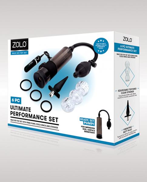 The 6 Piece Ultimate Performance Set from ZOLO contains all of the essentials for an unforgettable experience. Start with the penis pump that has an attached vibrating bullet for improved size, girth and sensitivity. Next comes a clear handheld stroker with a stimulating ribbed interior for a realistic penetration feel, and a vibrating butt plug with a tapered tip. Three cock rings of varying sizes round out this set, which is easy to use and suitable for all experience levels.